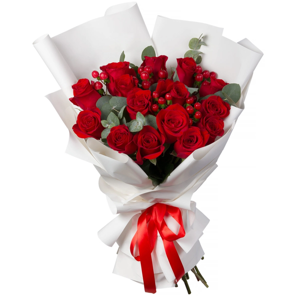 Элегантный букет из 15 красных роз с эвкалиптом – символ страсти и нежности
