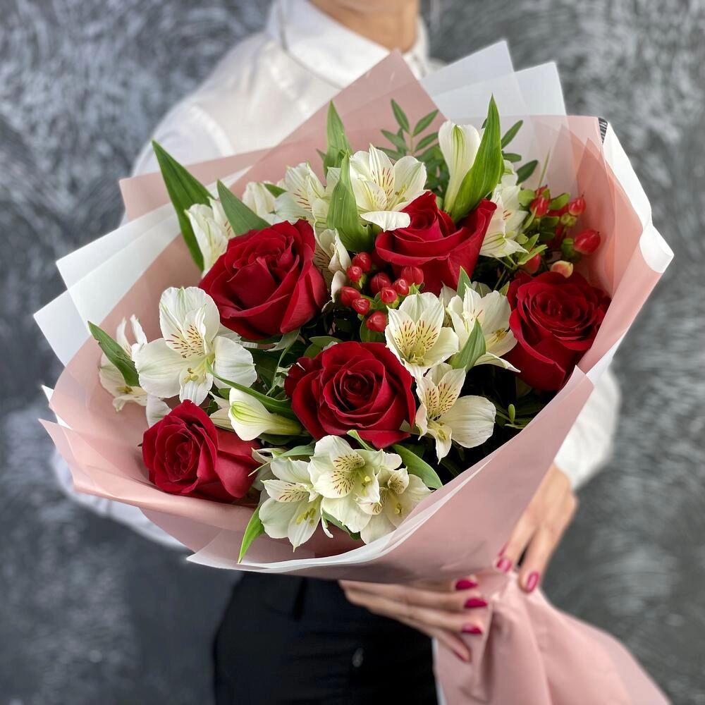 Элегантная композиция из 5 красных эквадорских роз и 4 белых альстромерий с добавлением фисташковой зелени и гиперикума. Изысканный подарок для особых моментов. Заказ цветов с доставкой на дом Петрозаводск.