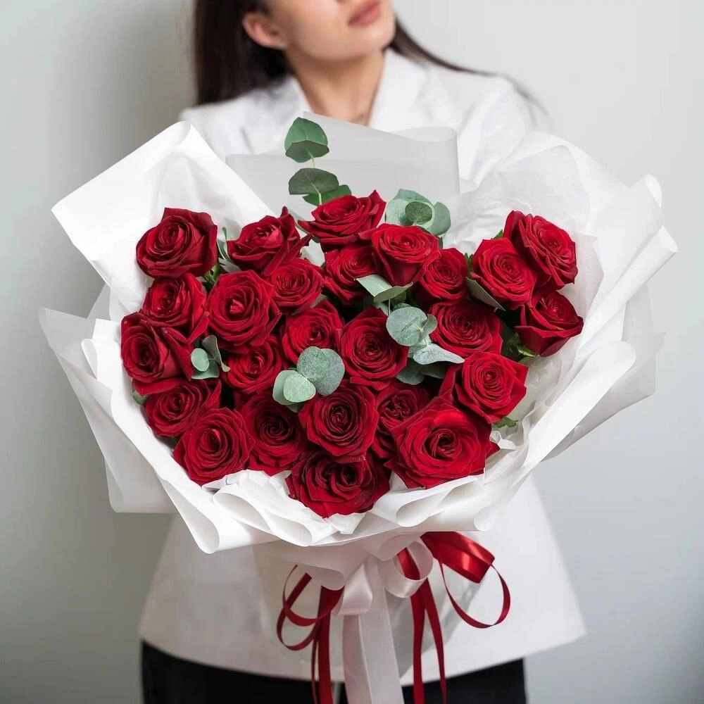 Элегантная композиция из 25 свежих красных роз с серебристыми веточками эвкалипта — воплощение страсти и изысканности. Идеальный выбор для особых моментов и важных признаний. Купить букет роз в Петрозаводске.